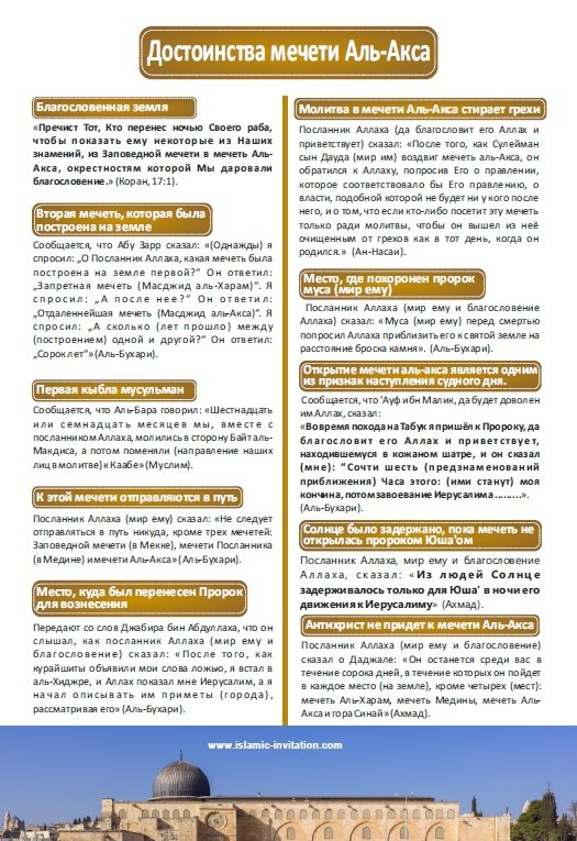 Посланник Аллаха (мир ему) сказал: «Не следует отправляться в путь никуда, кроме трех мечетей: Заповедной мечети (в Мекке), мечети Посланника (в Медине) и мечети Аль-Акса» (Аль-Бухари).