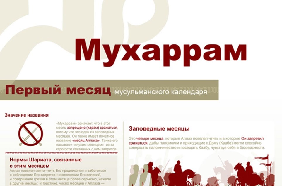 «Мухаррам» означает, что в этот месяц запрещено (харам) сражаться, потому что это один из заповедных месяцев. Он также имеет почётное название «месяц Аллаха». Также его называют «глухим месяцем» из-за строгости связанных с ним запретов.