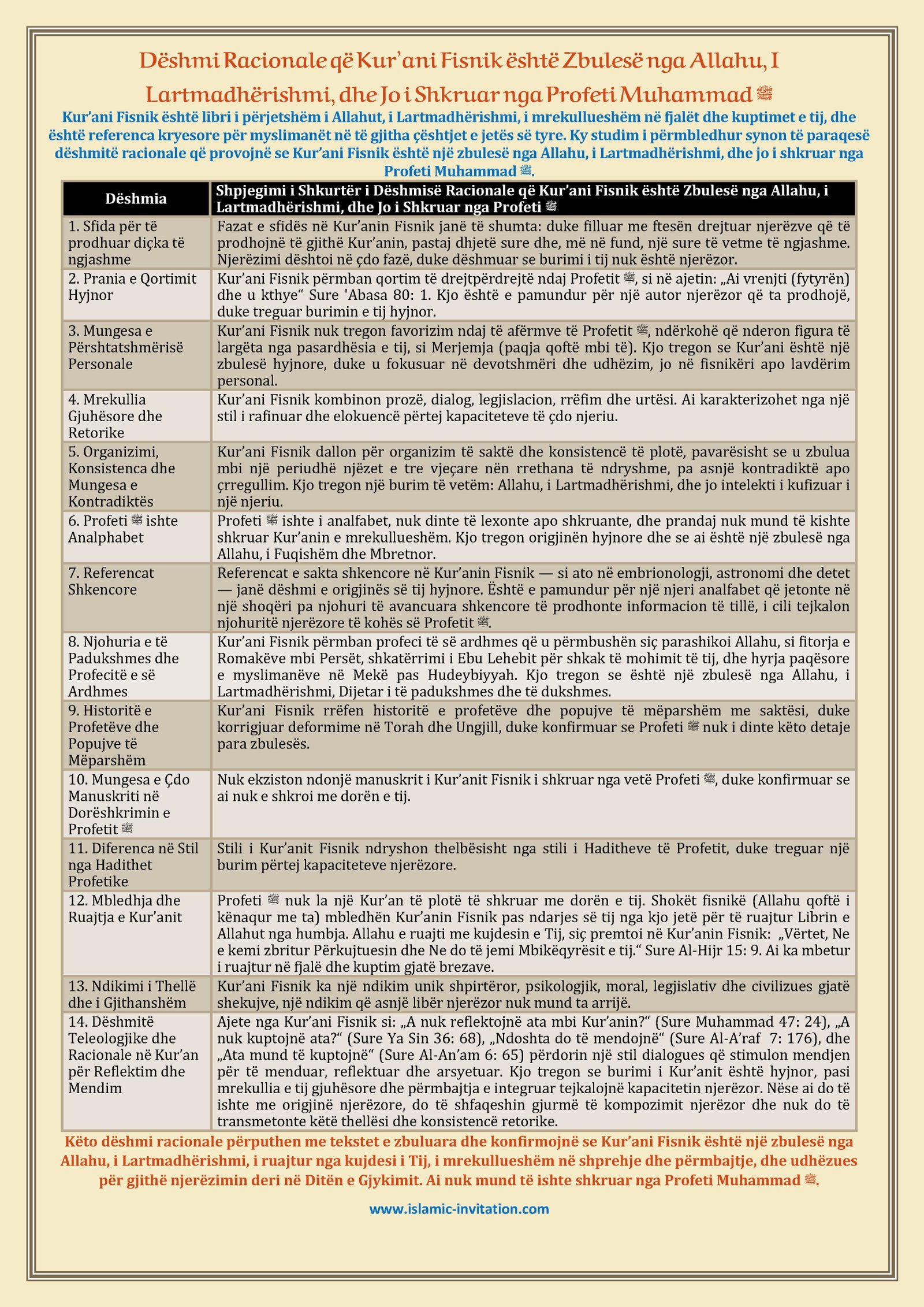 Kur’ani Fisnik është libri i përjetshëm i Allahut, i Lartmadhërishmi, i mrekullueshëm në fjalët dhe kuptimet e tij, dhe është referenca kryesore për myslimanët në të gjitha çështjet e jetës së tyre. Ky studim i përmbledhur synon të paraqesë dëshmitë racionale që provojnë se Kur’ani Fisnik është një zbulesë nga Allahu, i Lartmadhërishmi, dhe jo i shkruar nga Profeti Muhammad ﷺ.