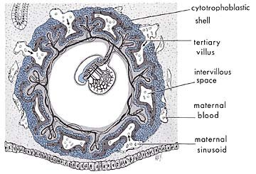 Figur 2. På dette diagram kan man se, hvordan fosteret er ophængt i livmoderen (uterus) på alaqah stadiet. (The Developing Human, Moore and Persaud, 5th ed., p. 66).