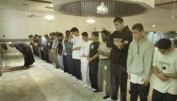 Alguns dos estudantes da Escola Noor-ul-Iman se unem aos homens para a oração da tarde na Sociedade Islâmica de Nova Jérsei, uma mesquita no subúrbio de South Brunswick, Nova Jérsei, terça-feira, 13 de Maio de 2003. Muitas comunidades muçulmanas nos Estados Unidos estão se espalhando dos centros das cidades para os subúrbios. (AP Photo/Daniel Hulshizer)