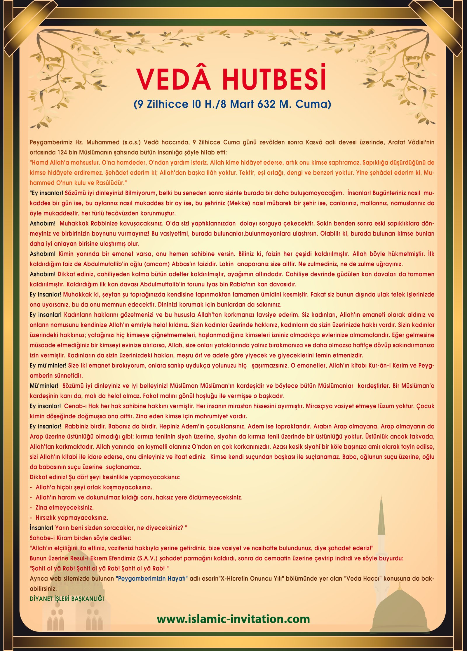 Peygamberimiz Hz. Muhammed (s.a.s.) Vedâ haccında, 9 Zilhicce Cuma günü zevâlden sonra Kasvâ adlı devesi üzerinde, Arafat Vâdisi'nin ortasında 124 bin Müslümanın şahsında bütün insanlığa şöyle hitab etti: