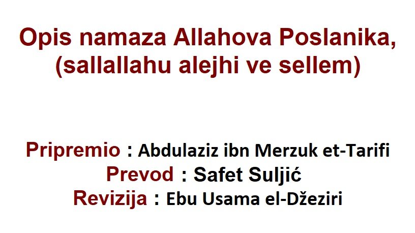 Veoma korisna knjiga koja pojašnjava namaz Allahova Poslanika, sallallahu alejhi ve sellem, u djelu i riječima, i to na lijep i jednostavan način uz pomen dokaza. OPIS NAMAZA ALLAHOVA POSLANIKA (sallallahu alejhi ve sellem) Autor Sheikh Abdulaziz ibn Merzuk et-Tarifi
