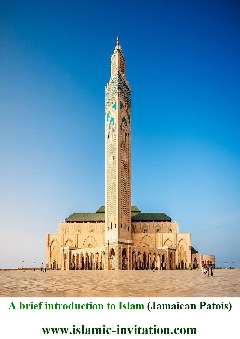 Islam a nuh new religion. Islam mean submission / surrender to di Will a God "Allah". Mozlim biliib ina prafit ah mesinja (piis bi pahn dem aal) laka: Iebriam, Muoziz, Jiizas, ah Muhammad (di laas a di prafit ah mesinjadem). Di Islamic position: All dem prophets an messenger yah come wid di same Islamic message. A brief introduction to Islam - Patwah (Jamaican Creole Patois)
