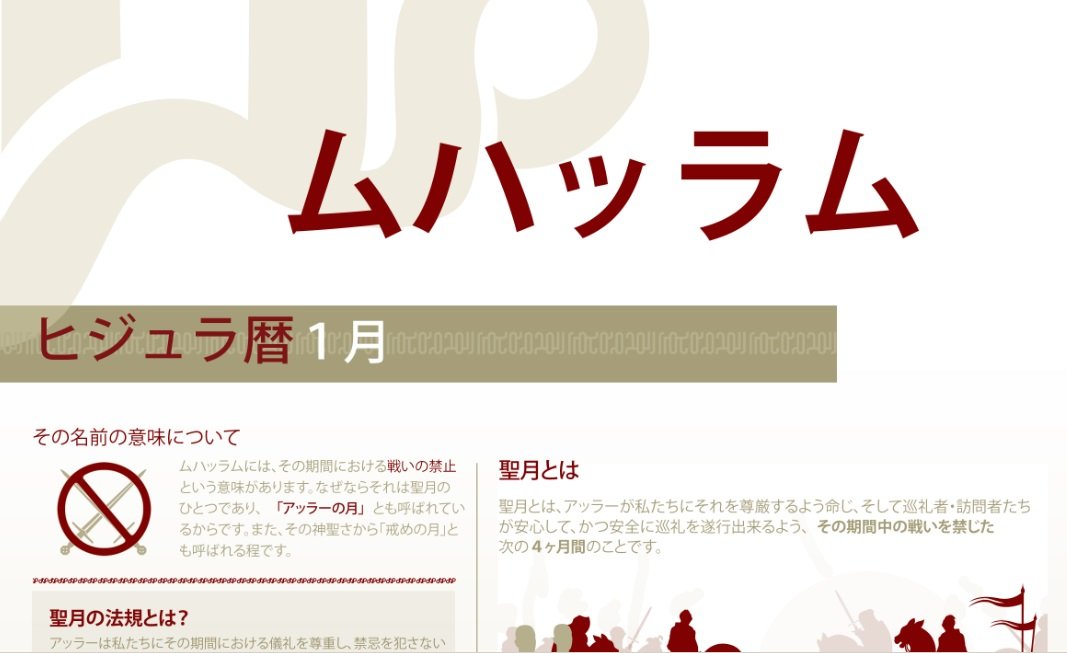 ムハッラム-ヒジュラ暦 1月 ムハッラム このインフォグラフィックでは「神聖なるアッラーの月」について、またその名称の意味と、聖月についての法規、その徳、そしてなぜそれがヒジュラ暦の第1月なのかが説明されます。またアーシューラーの日についても言及され、その名称の意味、アーシューラーの断食の法規とその徳についてが複数の言語で提供されます。