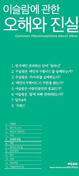 이슬람에관한 오해ㅐ와 진실 1. 한국에만존재하는단어 “알라신” 2. 무슬림은 ‘예언자 무함마드’를숭배하는가? 3. 무슬림은 ‘카아바’를숭배하는가? 4. ‘예언자무함마드’가꾸란을썼는가? 5. 이슬람은아랍인들만의 종교인가? 6. 이슬람은 ‘칼’에의해 전파되었는가?
