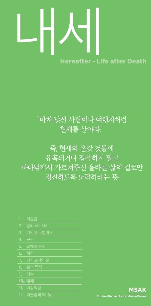 내세 “마치 낯선 사람이나 여행자처럼 현세를 살아라.” 즉, 현세의 온갖 것들에 유혹되거나 집착하지 말고 하나님께서 가르쳐주신 올바른 삶의 길로만 정진하도록 노력하라는 뜻