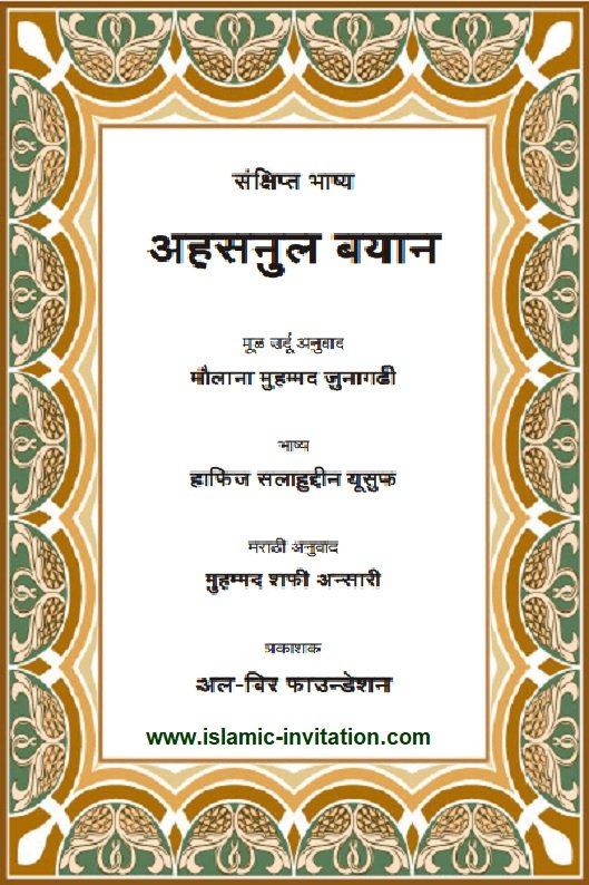 नोबल कुरआनच्या अर्थांचे हिंदी मराठी भाषेत भाषांतर, ज्याचा अनुवाद मुहम्मद शफी' अल-अन्सारी यांनी केला आहे, जो उर्दू अनुवादातून घेतला आहे, “कुरआनचा अर्थ लावणारे सर्वोत्तम विधान.” अनुवाद मुहम्मद जुनकरी यांनी केलेल्या श्लोकांचे अर्थ आणि हाफिज सलाहुद्दीन युसूफ यांचे स्पष्टीकरण आणि मुंबईतील अल बेर फाऊंडेशनने प्रकाशित केलेले.