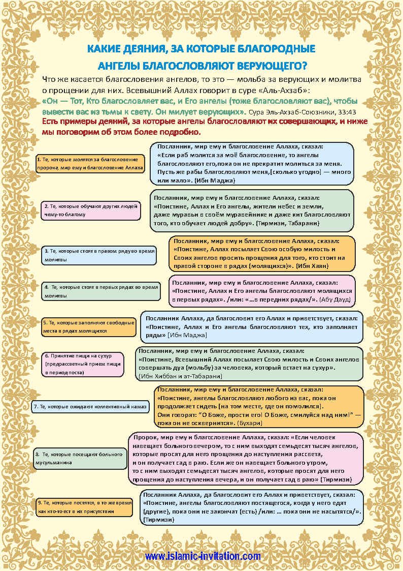 КАКИЕ ДЕЯНИЯ, ЗА КОТОРЫЕ БЛАГОРОДНЫЕ АНГЕЛЫ БЛАГОСЛОВЛЯЮТ ВЕРУЮЩЕГО? Что же касается благословения ангелов, то это — мольба за верующих и молитва о прощении для них. Всевышний Аллах говорит в суре «Аль-Ахзаб»: «Он — Тот, Кто благословляет вас, и Его ангелы (тоже благословляют вас), чтобы вывести вас из тьмы к свету. Он милует верующих». Сура Эль-Ахзаб-Союзники, 33:43 Есть примеры деяний, за которые ангелы благословляют их совершающих, и ниже мы поговорим об этом более подробно.