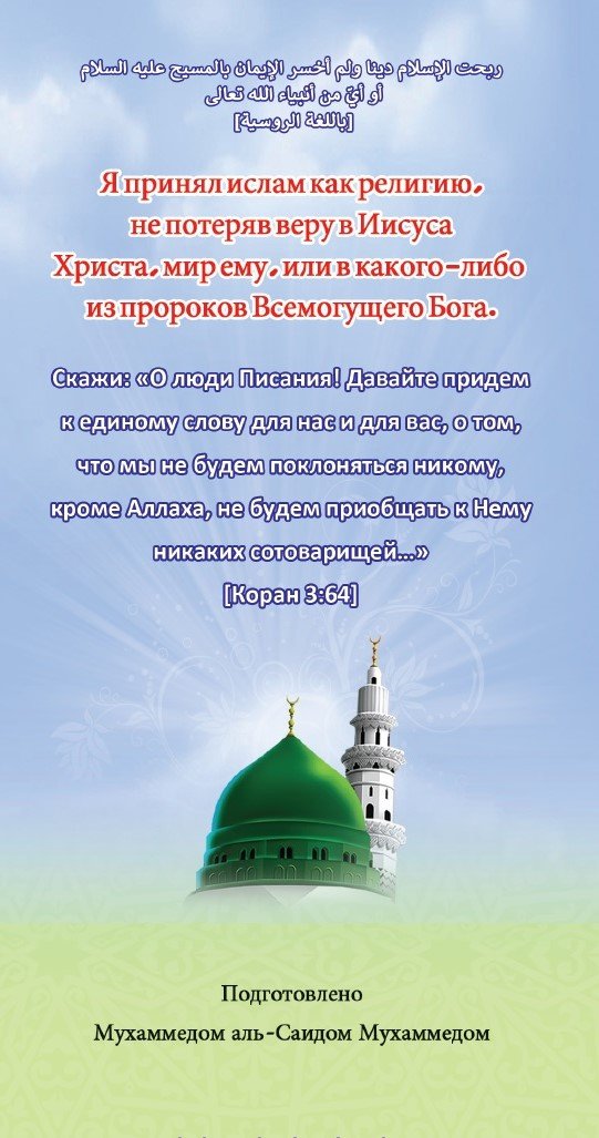 Япринял ислам как религию, не потеряв веру в Иисуса Христа, мир ему, или в какого-либо из пророков Всемогущего Бога. ( Брошюра )