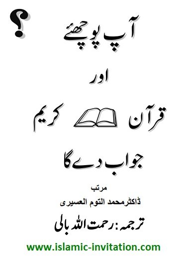 آپ پوچھئے اور قرآن کریم جواب دے گا یہ ایک چھوٹی سی کتاب ہے جس میں قرآنی آیات کے ذریعے 32 سوالات کا جواب دیا گیا ہے۔ یہ اللہ کے حقیقی خالق، پچھلی امتوں، عبادت کے معنی، قرآن کو فساد سے بچانے، حضرت محمد صلی اللہ علیہ وسلم اور حضرت عیسیٰ علیہ السلام، مومنوں اور کافروں دونوں کی آخرت اور منزل کے بارے میں سوالات کے جوابات دیتا ہے۔ ایک پیغام جس میں 32 سوالات کے جوابات مصنف نے قرآن پاک کی آیات کے ذریعے دیے۔