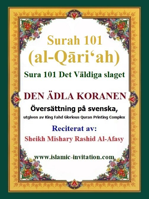 Sura 101 Det Väldiga slaget Surah 101 (al-Qāriʻah) - DEN ÄDLA KORANEN - Översättning på svenska, utgiven av King Fahd Glorious Quran Printing Complex - Reciterat av Sheikh Mishary Rashid Al-Afasy. An audio translation of Surah al-Qari'ah from the Noble Quran in the Swedish language - recited by Sheikh Mishary Rashid Al-Afasy ترجمة صوتية لسورة القارعة من القرآن الكريم باللغة السويدية – تلاوة الشيخ مشاري راشد العفاسي