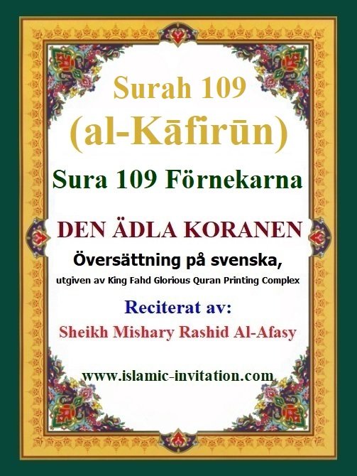 Sura 109 Förnekarna Surah 109 (al-Kāfirūn) – DEN ÄDLA KORANEN - Översättning på svenska, utgiven av King Fahd Glorious Quran Printing Complex - Reciterat av Sheikh Mishary Rashid Al-Afasy. An audio translation of Surah al-Kafirun from the Noble Quran in the Swedish language - recited by Sheikh Mishary Rashid Al-Afasy ترجمة صوتية لسورة الكافرون من القرآن الكريم باللغة السويدية – تلاوة الشيخ مشاري راشد العفاسي