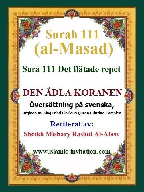 Sura 111 Det flätade repet Surah 111 (al-Masad) – DEN ÄDLA KORANEN - Översättning på svenska, utgiven av King Fahd Glorious Quran Printing Complex - Reciterat av Sheikh Mishary Rashid Al-Afasy. An audio translation of Surah al-Masad from the Noble Quran in the Swedish language - recited by Sheikh Mishary Rashid Al-Afasy ترجمة صوتية لسورة المسد من القرآن الكريم باللغة السويدية – تلاوة الشيخ مشاري راشد العفاسي