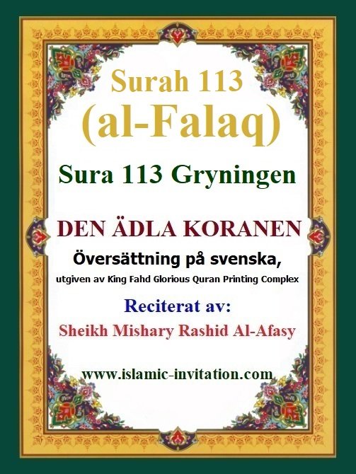 Sura 113 Gryningen Surah 113 (al-Falaq) – DEN ÄDLA KORANEN - Översättning på svenska, utgiven av King Fahd Glorious Quran Printing Complex - Reciterat av Sheikh Mishary Rashid Al-Afasy. An audio translation of Surah al-Falaq from the Noble Quran in the Swedish language - recited by Sheikh Mishary Rashid Al-Afasy ترجمة صوتية لسورة الفلق من القرآن الكريم باللغة السويدية – تلاوة الشيخ مشاري راشد العفاسي