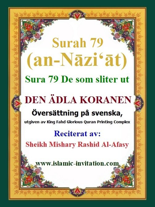 Sura 079 De som sliter ut Surah 079 (an-Nāziʻāt) – DEN ÄDLA KORANEN - Översättning på svenska, utgiven av King Fahd Glorious Quran Printing Complex - Reciterat av Sheikh Mishary Rashid Al-Afasy. An audio translation of Surah An-Nazia't from the Noble Quran in the Swedish language - recited by Sheikh Mishary Rashid Al-Afasy ترجمة صوتية لسورة النازعات من القرآن الكريم باللغة السويدية – تلاوة الشيخ مشاري راشد العفاسي