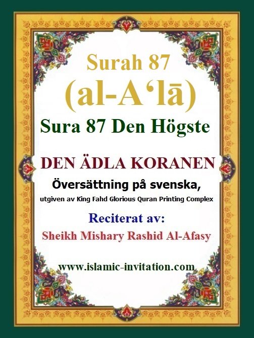 Sura 087 Den Högste Surah 087 (al-Aʻlā) - DEN ÄDLA KORANEN - Översättning på svenska, utgiven av King Fahd Glorious Quran Printing Complex - Reciterat av Sheikh Mishary Rashid Al-Afasy. An audio translation of Surah al-A'la from the Noble Quran in the Swedish language - recited by Sheikh Mishary Rashid Al-Afasy ترجمة صوتية لسورة الأعلى من القرآن الكريم باللغة السويدية – تلاوة الشيخ مشاري راشد العفاسي