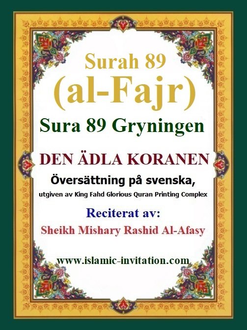Sura 089 Gryningen Surah 089 (al-Fajr) - DEN ÄDLA KORANEN - Översättning på svenska, utgiven av King Fahd Glorious Quran Printing Complex - Reciterat av Sheikh Mishary Rashid Al-Afasy. An audio translation of Surah al-Fajr from the Noble Quran in the Swedish language - recited by Sheikh Mishary Rashid Al-Afasy ترجمة صوتية لسورة الفجر من القرآن الكريم باللغة السويدية – تلاوة الشيخ مشاري راشد العفاسي