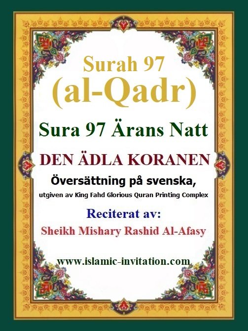 Sura 097 Ärans Natt Surah 097 (al-Qadr) - DEN ÄDLA KORANEN - Översättning på svenska, utgiven av King Fahd Glorious Quran Printing Complex - Reciterat av Sheikh Mishary Rashid Al-Afasy. An audio translation of Surah al-Qadr from the Noble Quran in the Swedish language - recited by Sheikh Mishary Rashid Al-Afasy ترجمة صوتية لسورة القدر من القرآن الكريم باللغة السويدية – تلاوة الشيخ مشاري راشد العفاسي